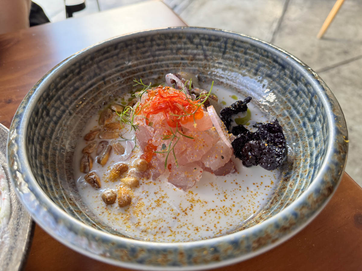 Esse abaixo é o Ceviche Lima-Bangkok (59 soles), com polvo, tapioca, milho e leite de tigre: